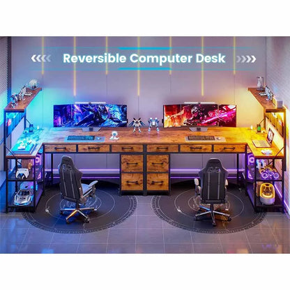 L-Shaped Corner Computer Desk: This all-in-one L-shaped desk features 5 drawers, storage shelves, a power outlet, LED lights, and a CPU stand, offering a versatile home office or gaming setup.