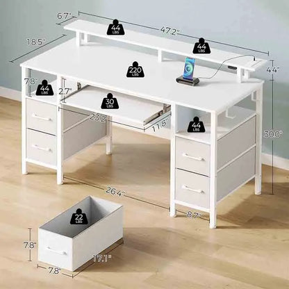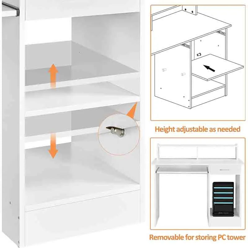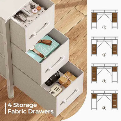 Spacious Storage: Equipped with 4 fabric drawers and 2 shelving tiers for ample storage, keeping files, office supplies, and gaming gear organized. The drawers and shelves are customizable for easy arrangement.