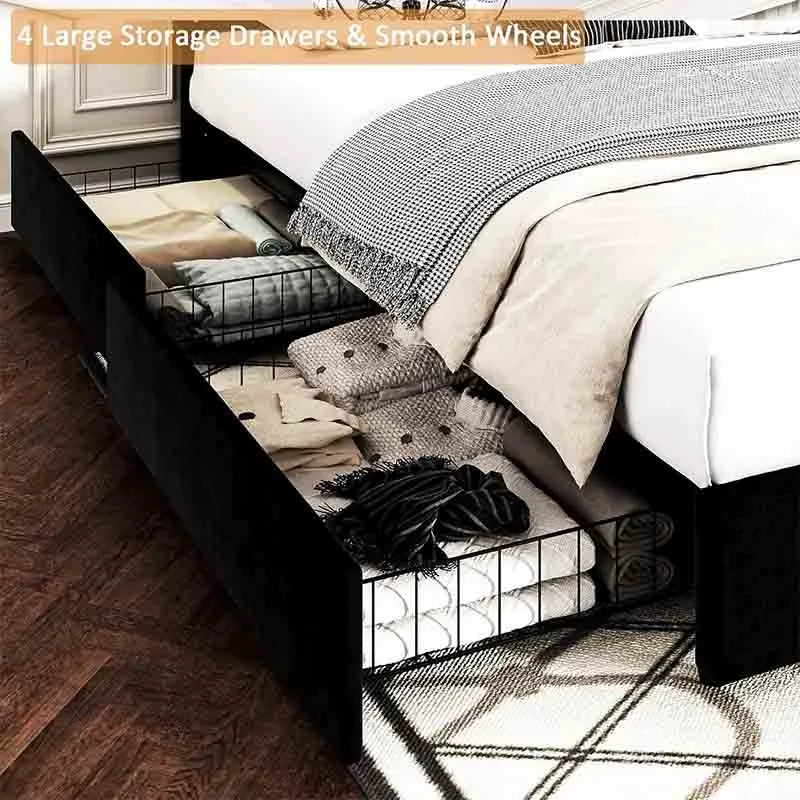Stylish Bed Frame with 4 Storage Drawers: Maximize space with four spacious drawers on easy-glide wheels for storing bedding, clothes, and more—keeping your bedroom neat and organized.