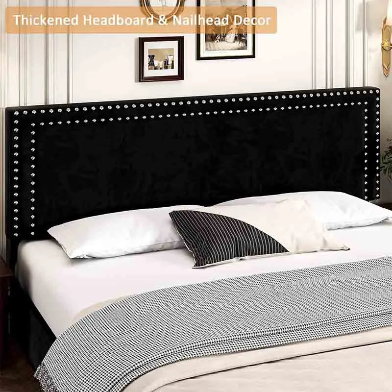 Adjustable Velvet Upholstered Headboard: Featuring stylish rivet trim and adjustable heights (40.1", 42.1", or 44.1") for mattresses up to 12 inches, the soft velvet headboard is padded for added comfort, perfect for reading or watching TV.