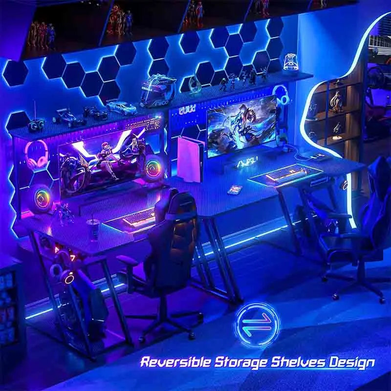 Durable & Stylish: Constructed with Z-shaped legs and cross beams for stability, plus a smooth carbon fiber surface that looks sleek and shines under LED lighting.